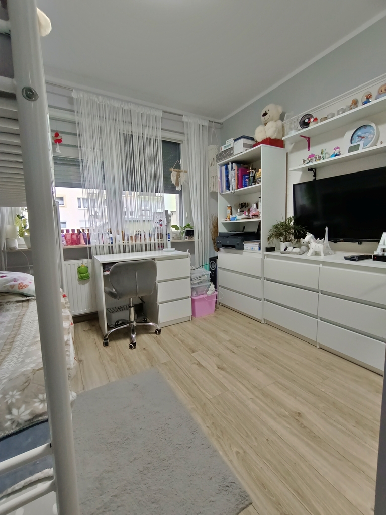 - Pokój dziecięcy jest w pełni funkcjonalny i wyposażony w łóżko dwupoziomowe, biurko, toaletkę dla małej kobietki, komody oraz dużą, pojemną szafę z drzwiami przesuwnymi.
