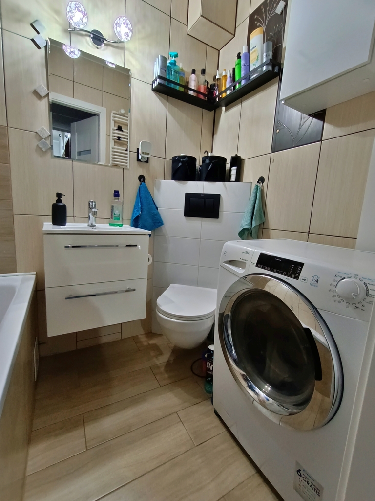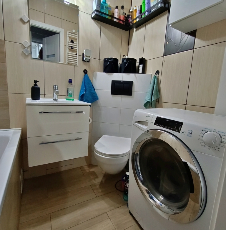 - W łazience: pralka, wanna oraz dużo szafek do przechowywania.