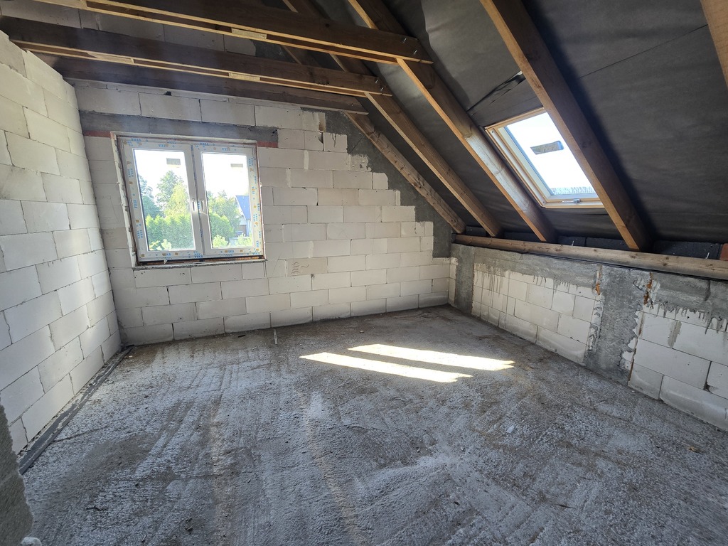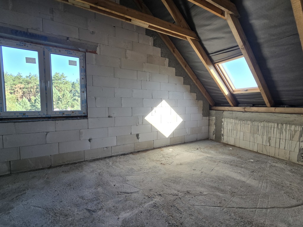 Dom posiada 4 sypialnie o powierzchni 15,44 m2, 14,72m2, 14,38m2(poddasze) i parter 9,53 m2, dodatkowo ogromnym atutem jest salon (23,01m2) otwarty na kuchnie (4,42m2).