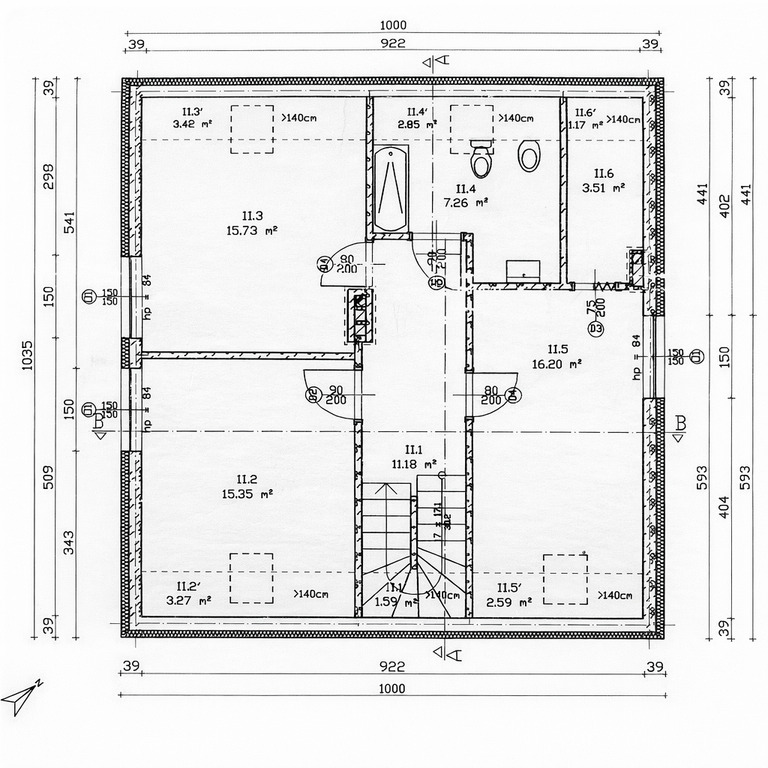 Budynek nie jest podpiwniczony. Wysokość budynku 8,28 m2, kąt dachu 40′ (dach dwu-spadowy)