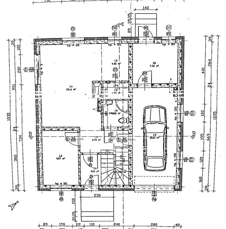 – Budynek o powierzchni użytkowej ( nie wliczając skosów wynosi 147,06 m2 w tym garaż w bryle 20,01 m2.)