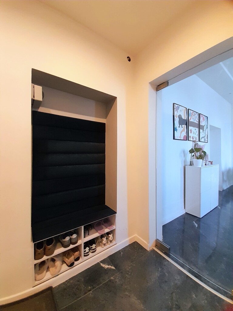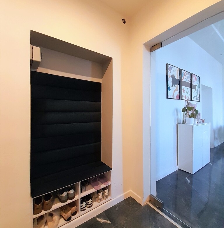 Korytarz (6 m²) został wyposażony w zabudowę stolarską, która umożliwia wygodne przechowywanie odzieży oraz sprzętów codziennego użytku.