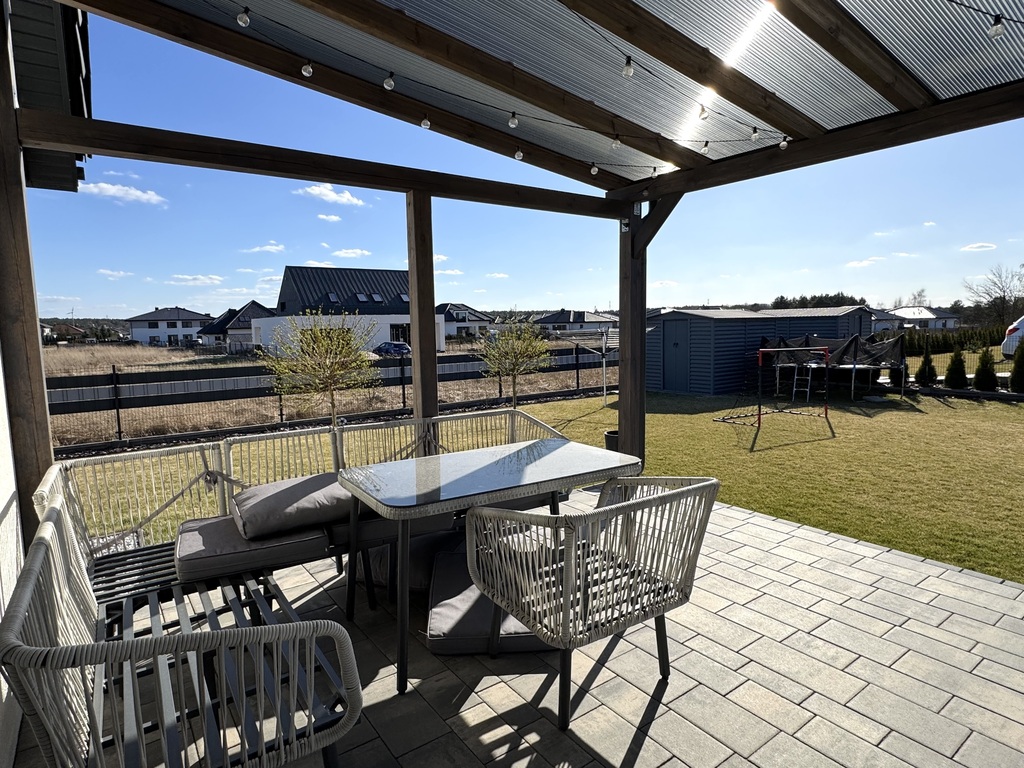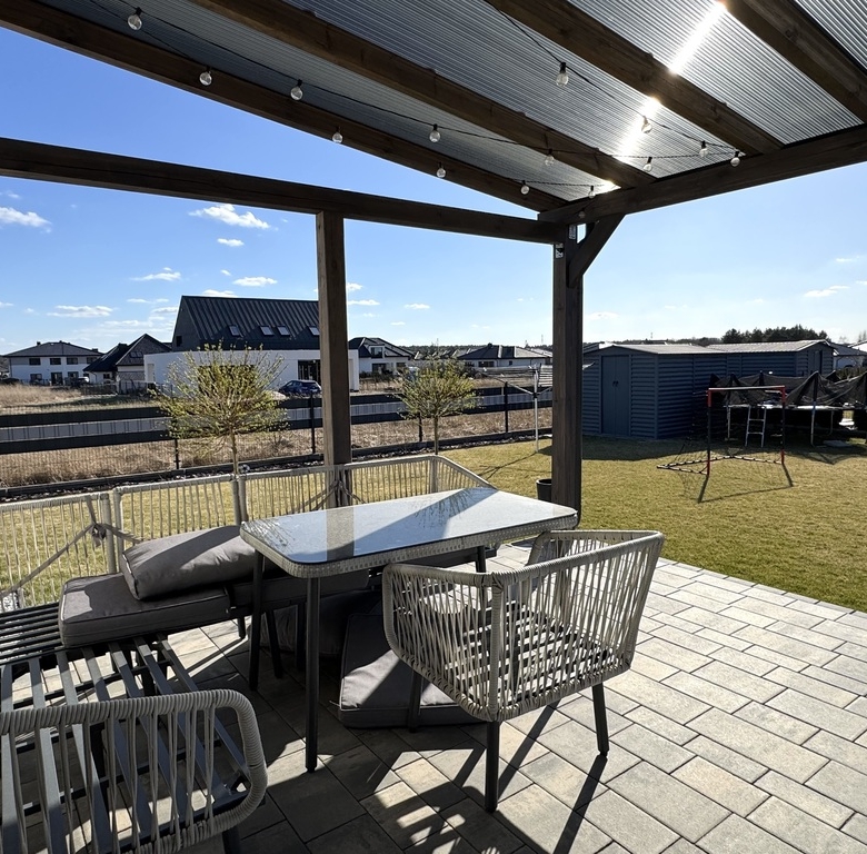 taras o powierzchni ok. 25 m² z meblami ogrodowymi, który stanowi naturalne przedłużenie salonu. To idealne miejsce na poranną kawę, rodzinne obiady czy wieczorny relaks.
