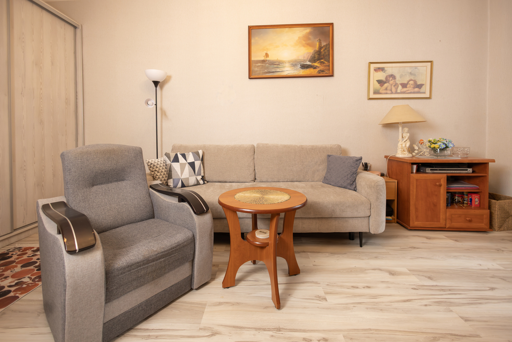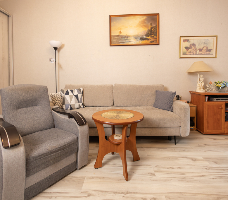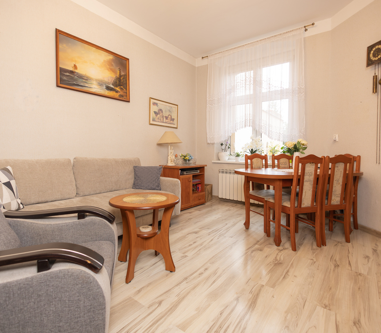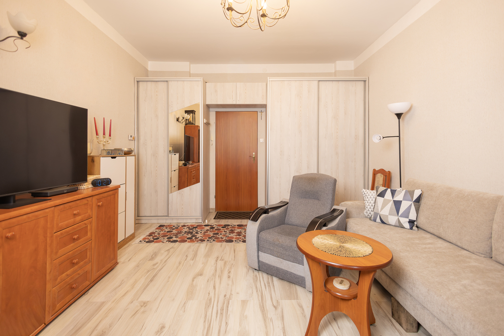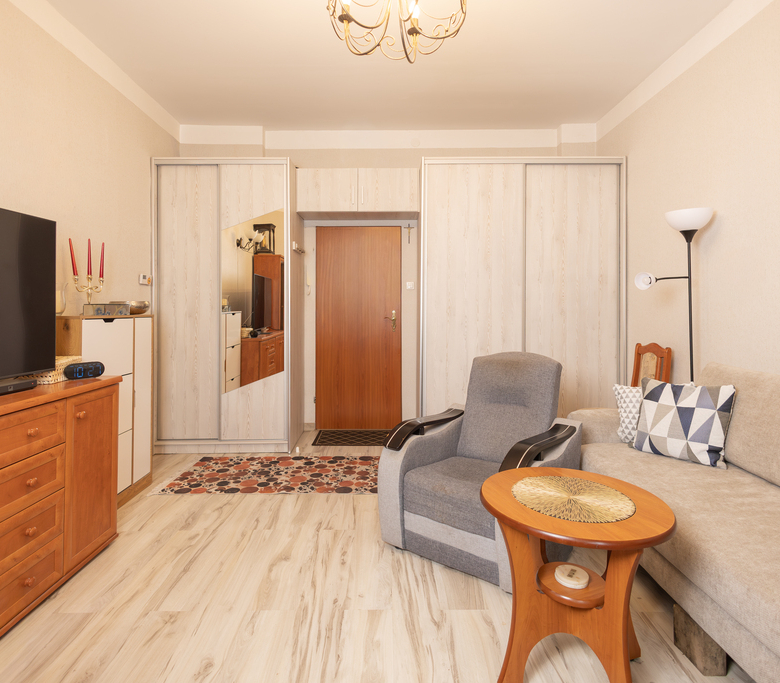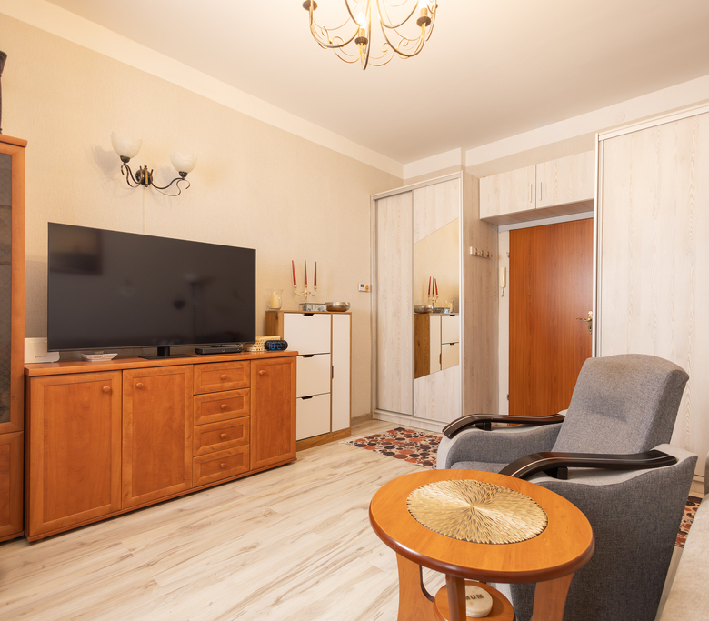 Układ pomieszczeń: - Przestronny salon z dwiema pojemnymi szafami w zabudowie, kanapą, komodą, stołem z krzesłami oraz telewizorem.