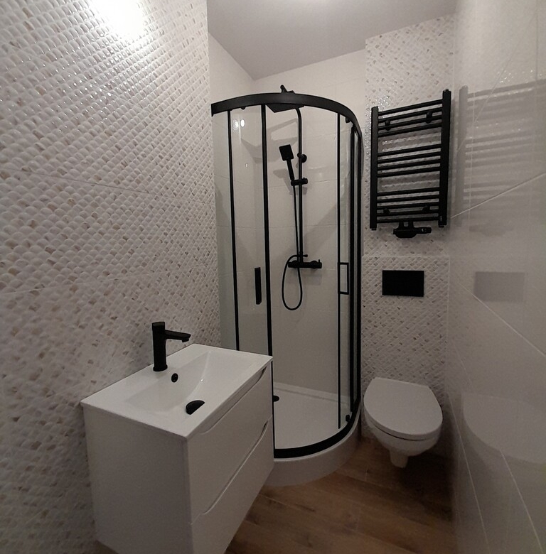 - Łazienka wykończona pod klucz – nowoczesna armatura, kabina prysznicowa, wysoka jakość wykończenia,