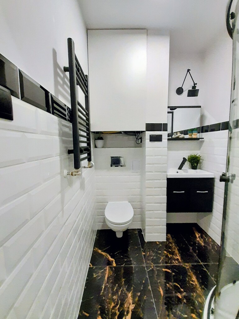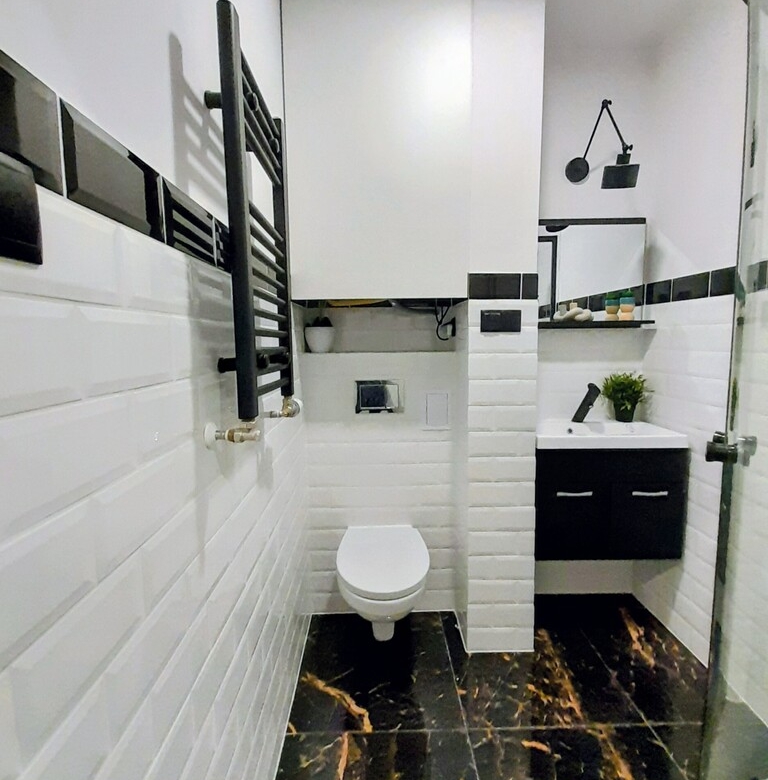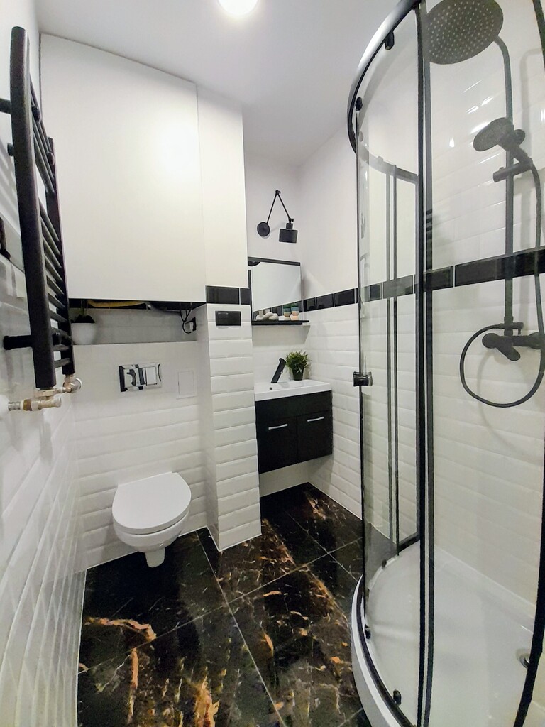 • łazienki z prysznicem, urządzonej w nowoczesnym stylu.