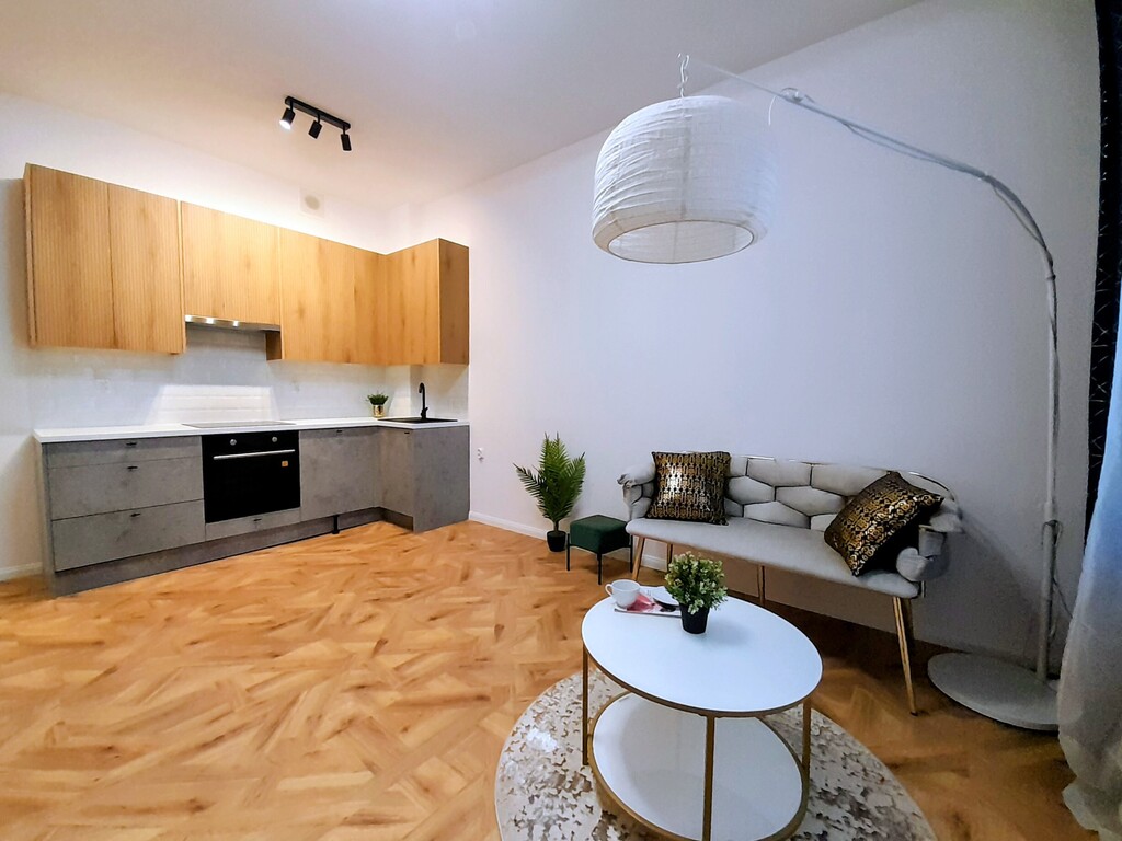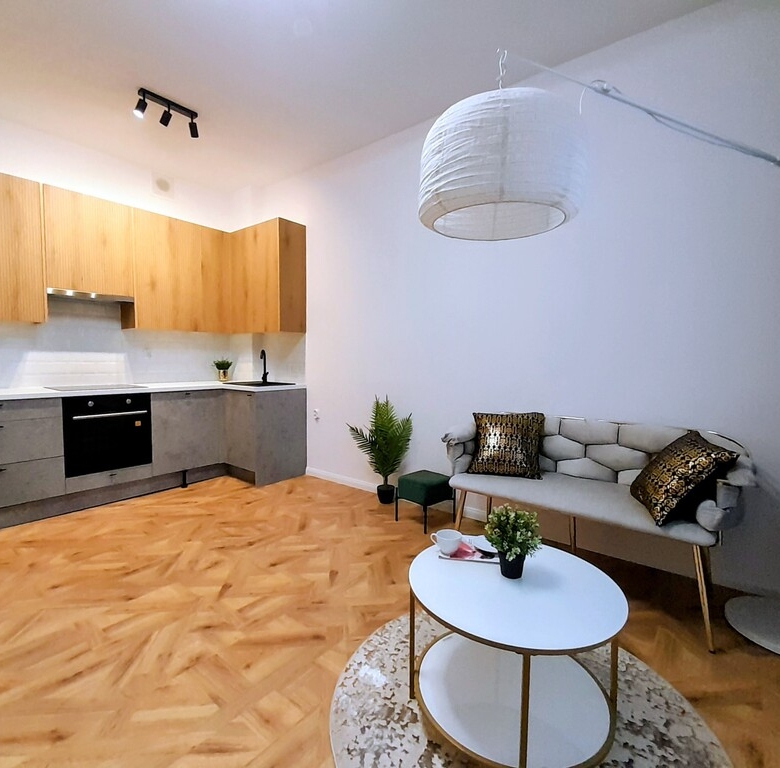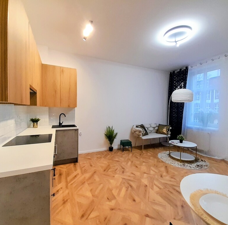 • przestronnego, otwartego salonu z umeblowanym aneksem kuchennym o powierzchni ok. 20 m²
