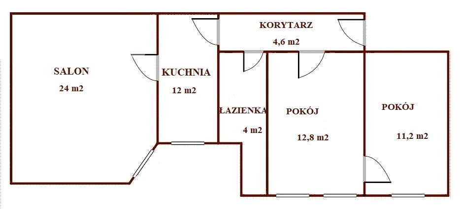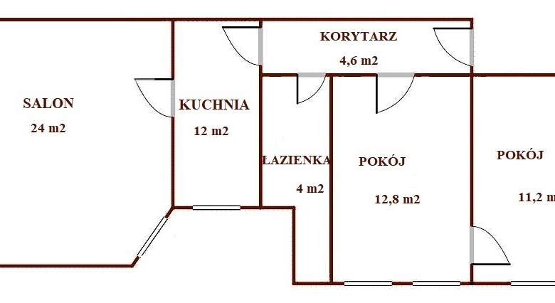 Układ pomieszczeń: - 3 pokoje (w tym jeden przechodni): 11,2 m² | 12,8 m² | 24 m²