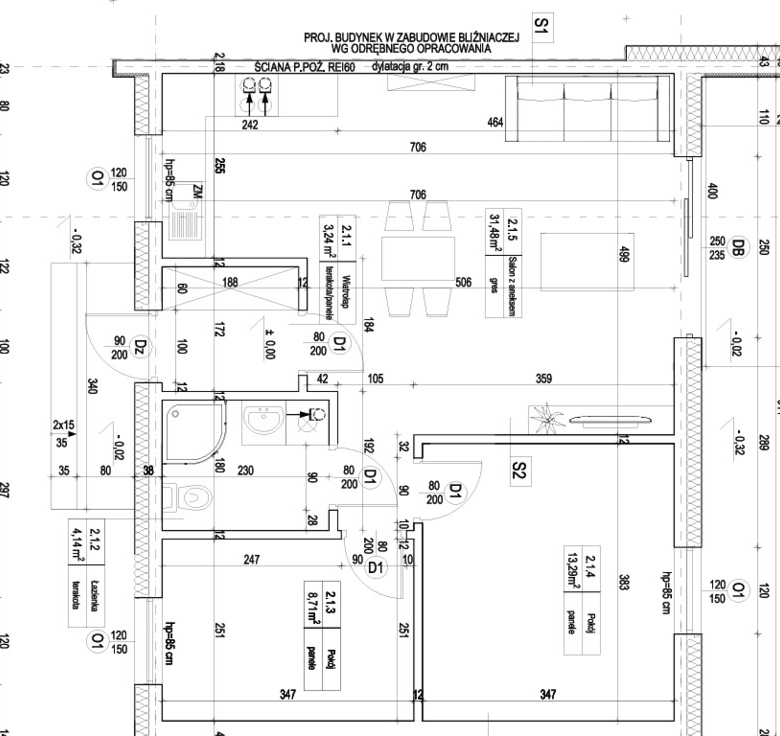 – salon z aneksem kuchennym: 31,48 m2 z wyjściem na taras i ogród
