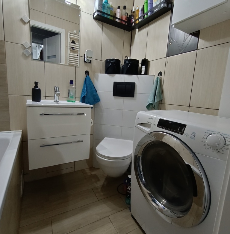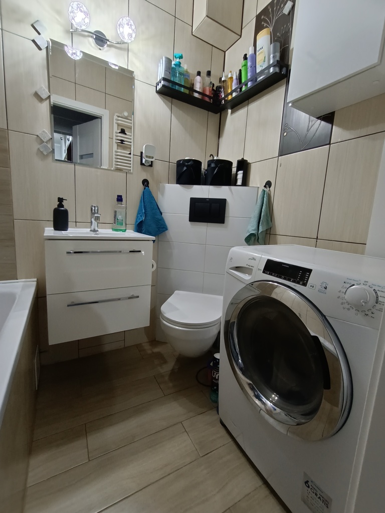 - W łazience: pralka, wanna oraz dużo szafek do przechowywania.