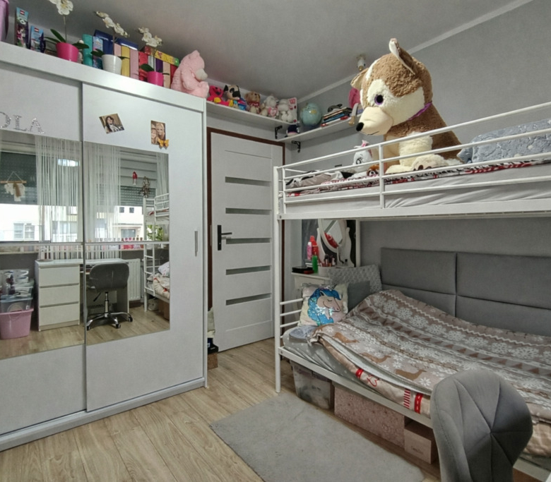 - Pokój dziecięcy jest w pełni funkcjonalny i wyposażony w łóżko dwupoziomowe, biurko, toaletkę dla małej kobietki, komody oraz dużą, pojemną szafę z drzwiami przesuwnymi.