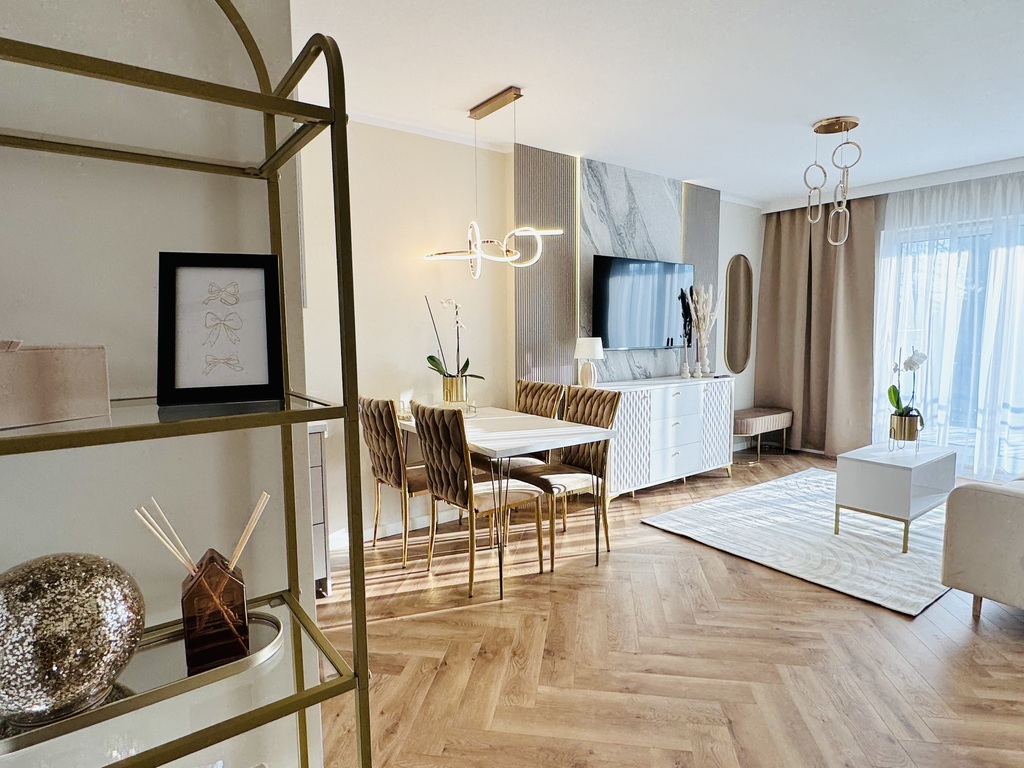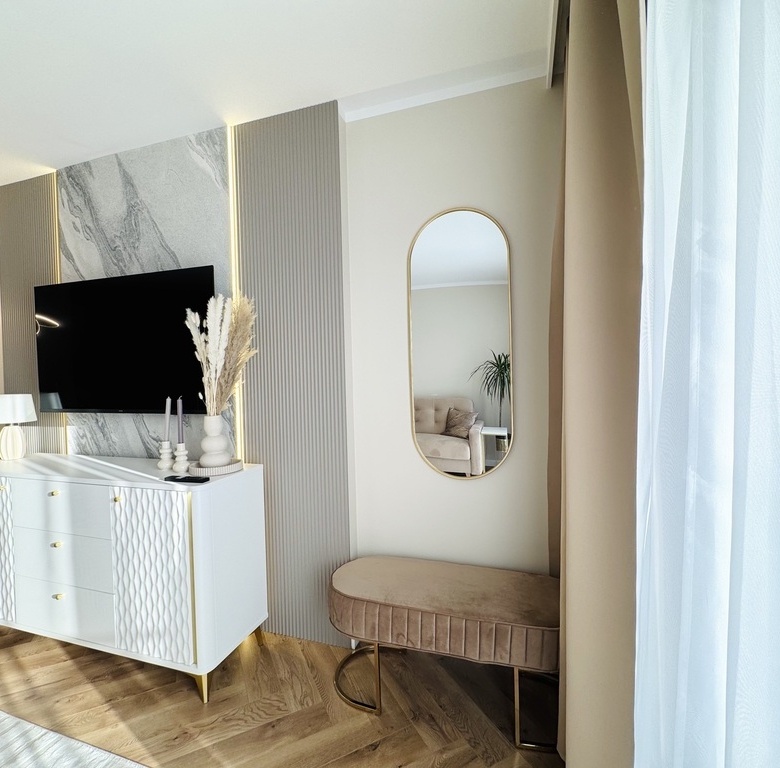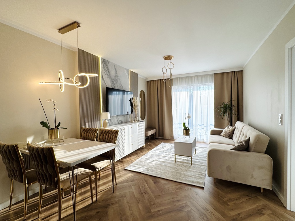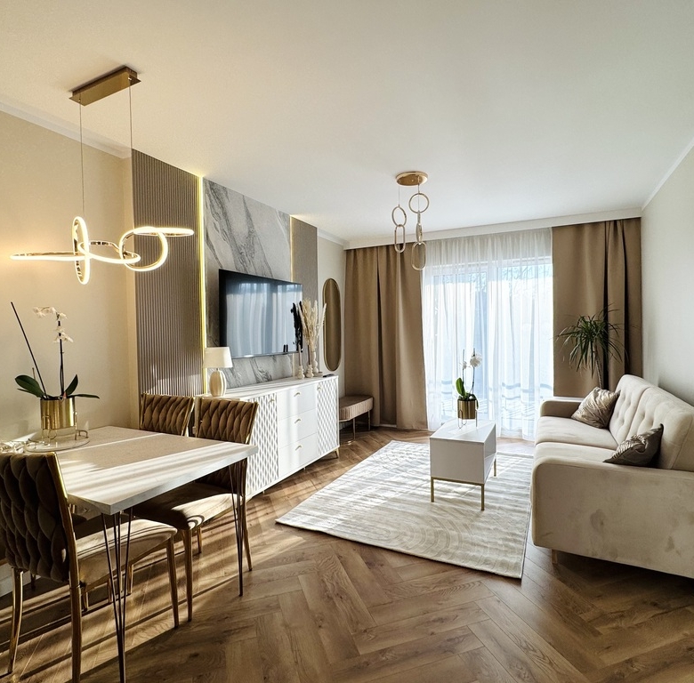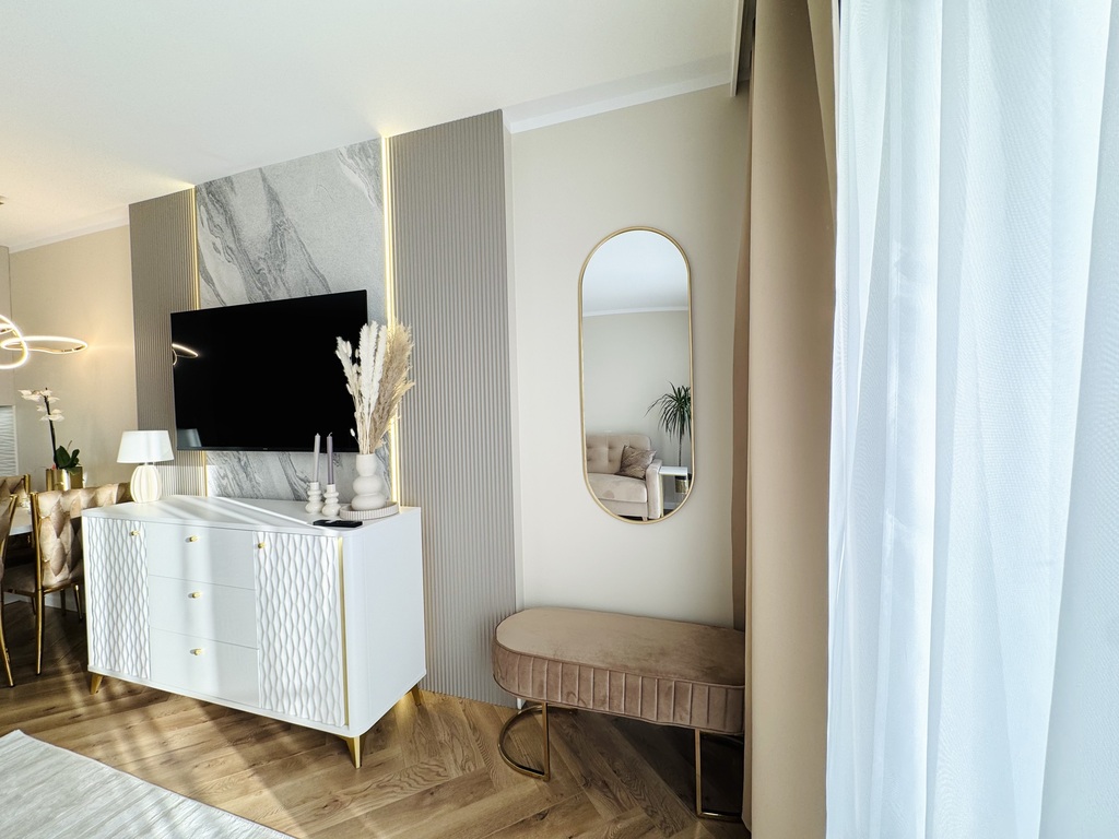 • Mieszkanie sprzedawane jest w pełni umeblowane i wyposażone, wszystkie meble oraz sprzęty AGD i RTV są nowe, na gwarancji.