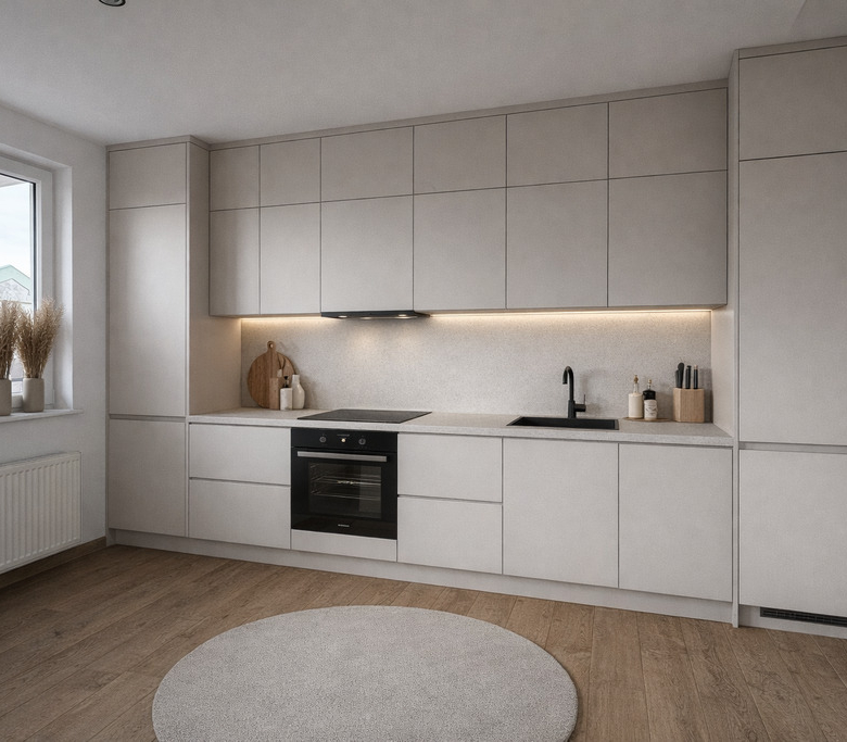 Salon z aneksem kuchennym sprawia, że mieszkanie wydaje się większe i bardziej przestronne. To idealne rozwiązanie dla osób ceniących nowoczesne wnętrza. Widoczna na materiałach kuchnia to wizualizacja – co ważne, zajmujemy się również