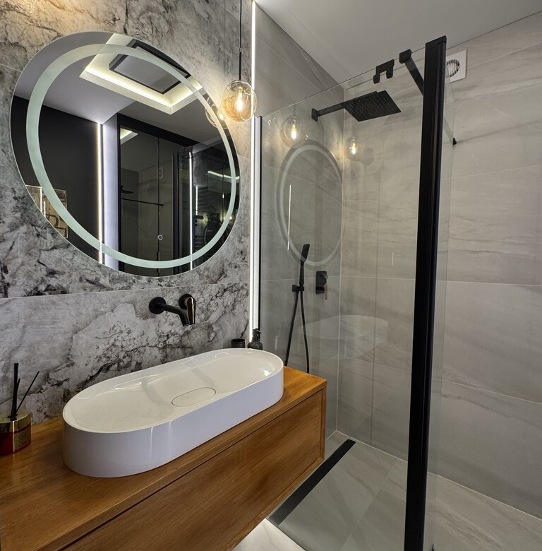 Mieszkanie przeszło gruntowny remont, obejmujący m.in. wymianę instalacji, grzejników i zmianę układu ścian, co pozwoliło uzyskać bardziej otwartą i jasną przestrzeń. Dodatki w mieszkaniu takie jak obrazy zostały wykonane na specjalne zlecenie.  Całość dopełnia duża ilość luster grafitowych, które powiększają optycznie przestrzeń.